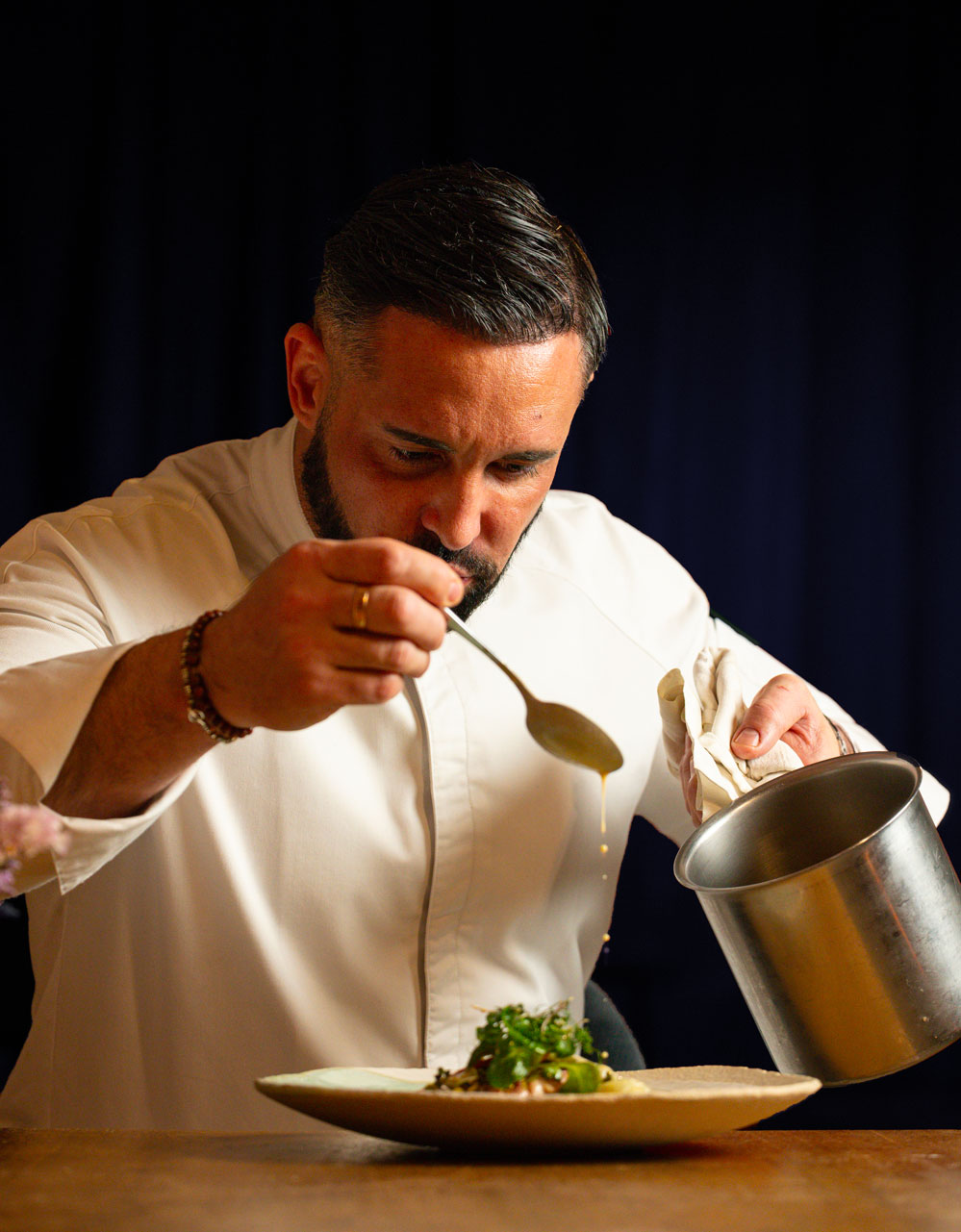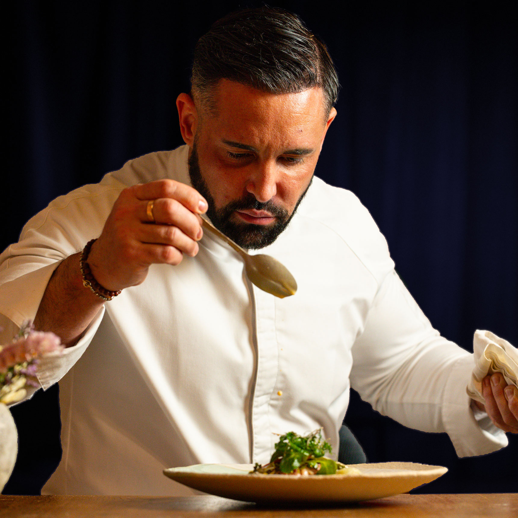 « La gastronomie est l’art d’utiliser la nourriture pour créer le bonheur », cette phrase du sociologue Théodore Zeldin pourrait être sa devise tant elle lui colle à la peau. C’est bien cette notion du bonheur qui le pousse chaque matin à se lever, couteaux en main et cœur ouvert. Cet homme qui aime rire autant que se dépasser est avant toute chose amoureux de la vie et ses instants de grâce.